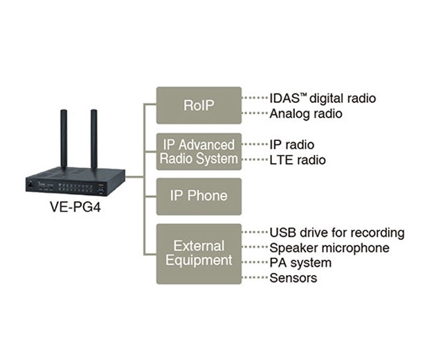 De VE-PG4 bevat ingebouwde RoIP-, SIP-gateway-, IP-router-, IP-telefooncentrale en IP-communicatie terminalcontrollerfuncties, alles in één unit. In vergelijking met een soortgelijk systeem dat meerdere apparaten combineert, kan bij de geïntegreerde VE-PG4 de installatie en het beheer eenvoudiger zijn, met minder instellingsconflicten.